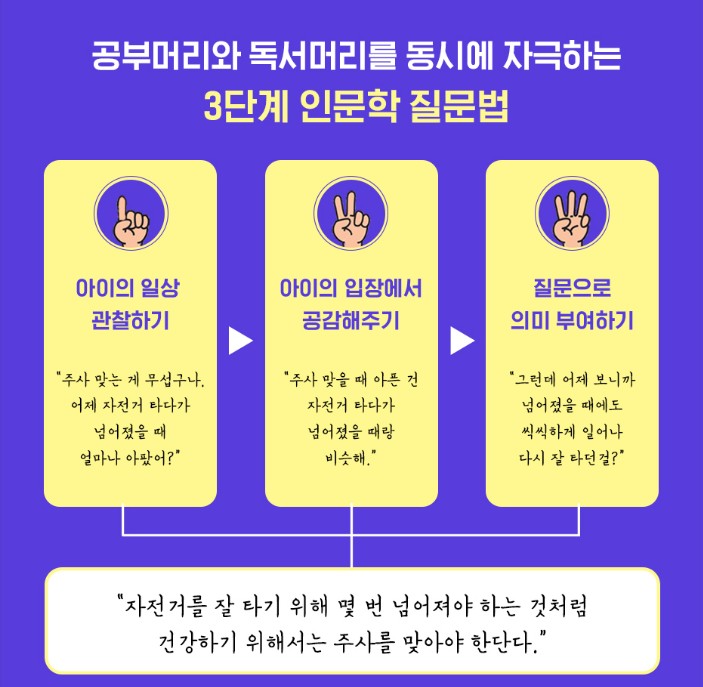 <하루 한마디 인문학 질문의 기적>는 공부 머리와 독서 머리를 동시에 자극하는 3단계 인문학 질문법을 알려준다고 합니다.